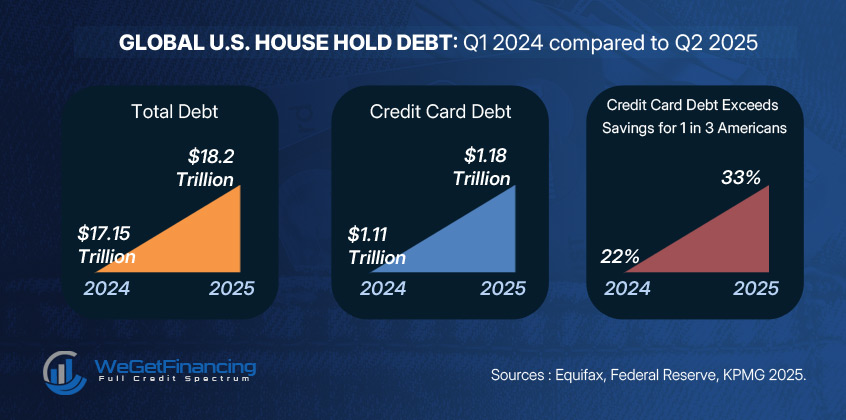 In February 2025, total U.S. consumer debt hit $17.68 trillion, with credit card balances reaching $1.06 trillion, up 4.4% year-over-year (Equifax, Federal Reserve). At the same time, one-third of Americans reported having more credit card debt than savings (KPMG, 2025).